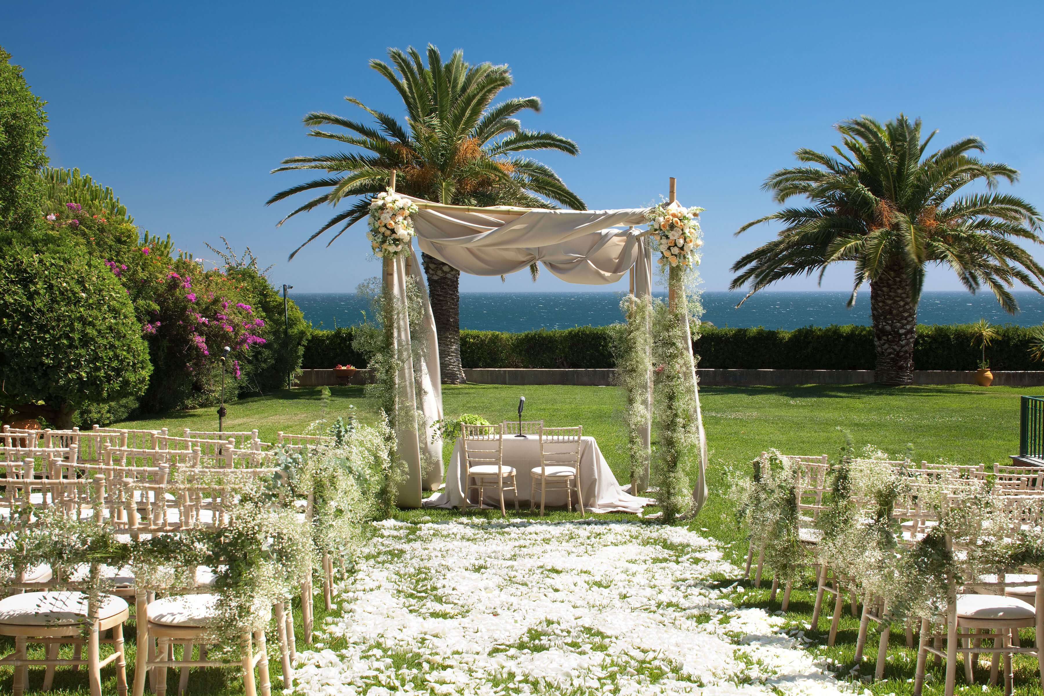 Um amplo jardim com palmeiras de frente para o mar, uma sala de eventos/conferências, adjacente a um jardim privado com uma pequena fonte encantadora, um terraço exterior e salas de jantar interiores com vista para o mar, e um estacionamento privado.